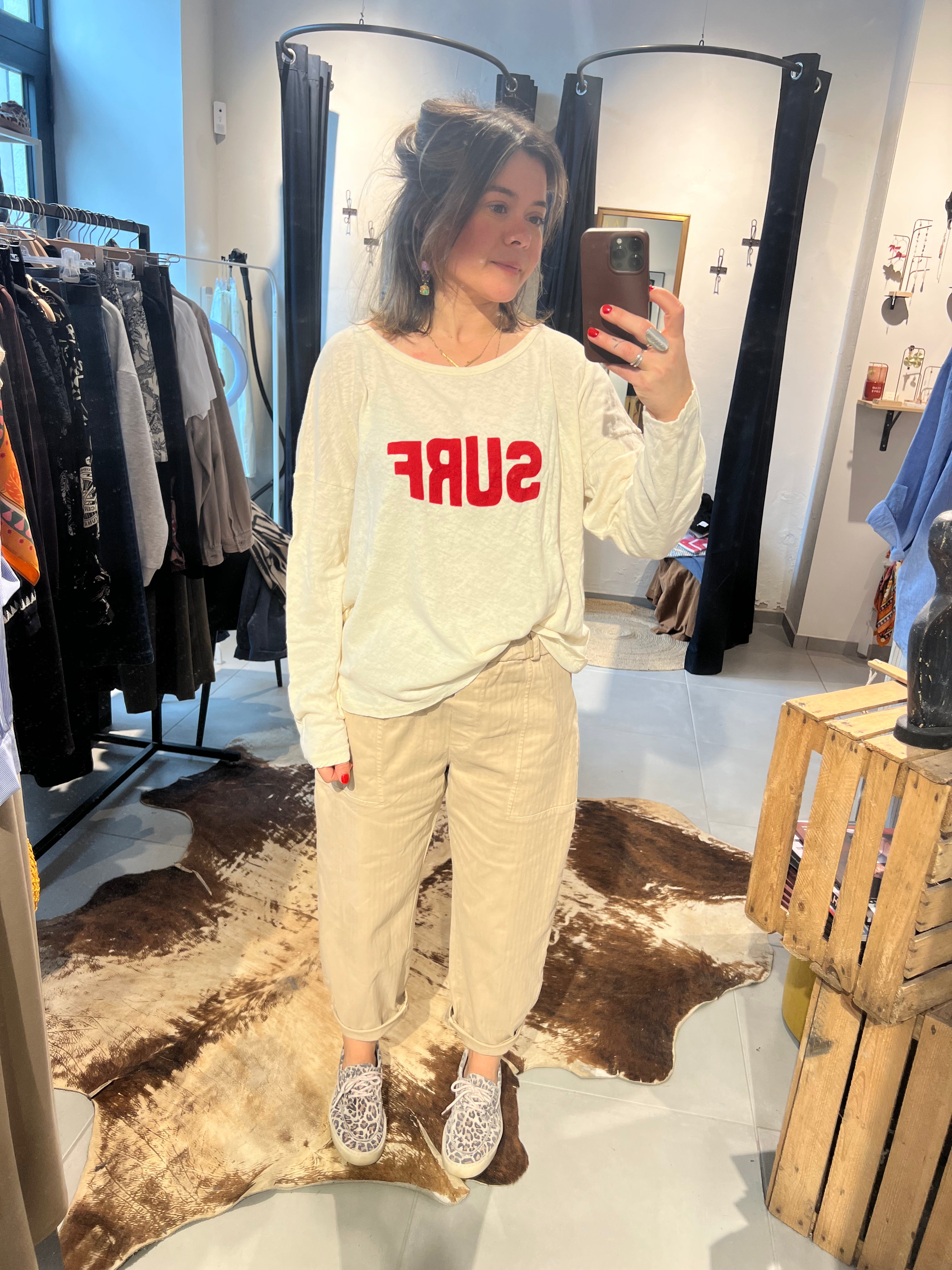 Effortless style meets comfort in this long-sleeved cotton tee. Crafted from lightweight, breathable fabric, it's perfect for layering or wearing solo. The bold "Surf" print adds a relaxed, casual vibe to your everyday wardrobe. Ideal for those who appreciate quality basics with character.