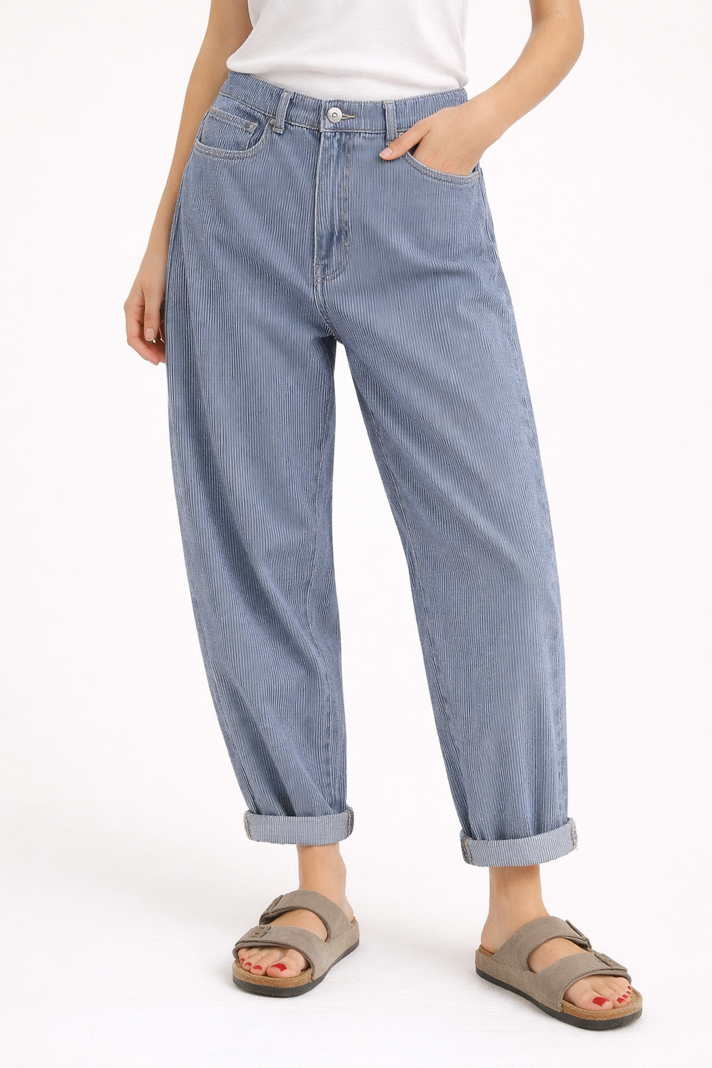 Effortlessly sophisticated, these barrel trousers feature subtle vertical stripes that add understated texture to your wardrobe. The relaxed silhouette offers comfort without compromising on style, while the rich mulberry tone works seamlessly with both neutral and bold pieces. Perfect for creating polished, contemporary looks that transition from day to evening.
